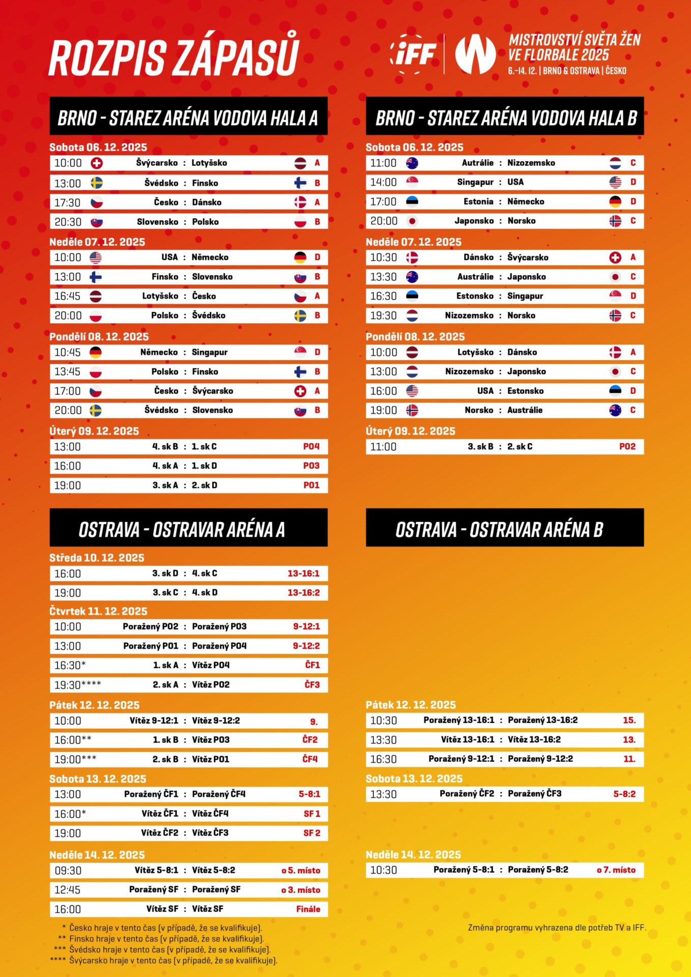 Na play-off se šampionát přesune do Ostravy. Tamní OSTRAVAR ARÉNA se stala dějištěm finálových bojů i v roce 2013, v letech 2018 a 2019 pak hostila také dva ročníky florbalového superfinále. „Je nám nesmírnou ctí, že Ostrava bude již podruhé hostit Mistrovství světa ve florbalu žen. Tento prestižní turnaj je pro naše město nejen příležitostí ukázat svou pohostinnost a organizační schopnosti, ale také jedinečnou šancí pro naše občany zažít atmosféru světového sportu přímo na domácí půdě. Naše město se promění v epicentrum florbalového dění, kde se setkají nejlepší hráčky světa, aby bojovaly o mistrovský titul. Tato událost bude bezesporu velkou inspirací pro mladé sportovce a sportovkyně, kteří budou mít příležitost vidět své idoly v akci,“ uvádí Jan Dohnal, primátor města Ostravy.